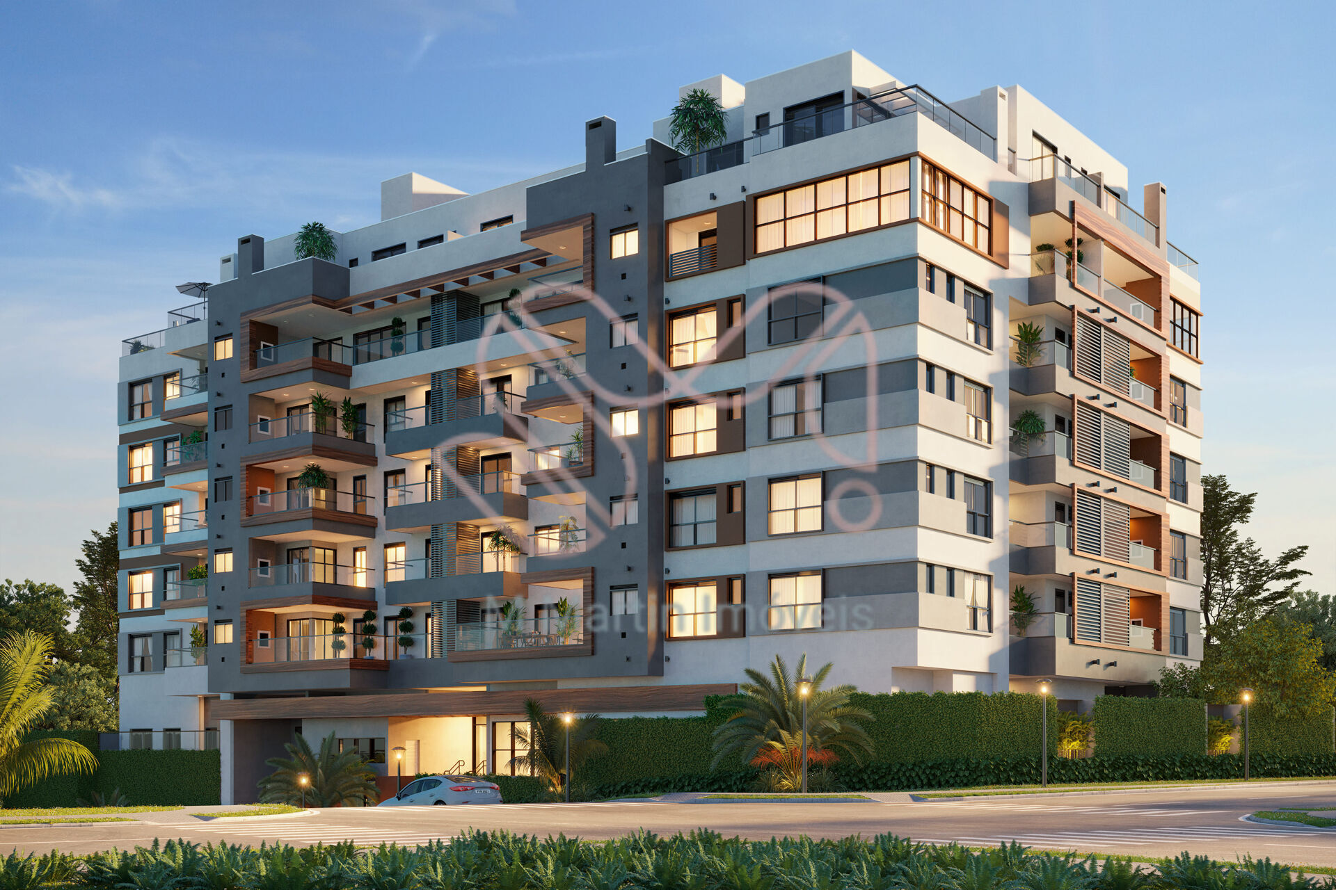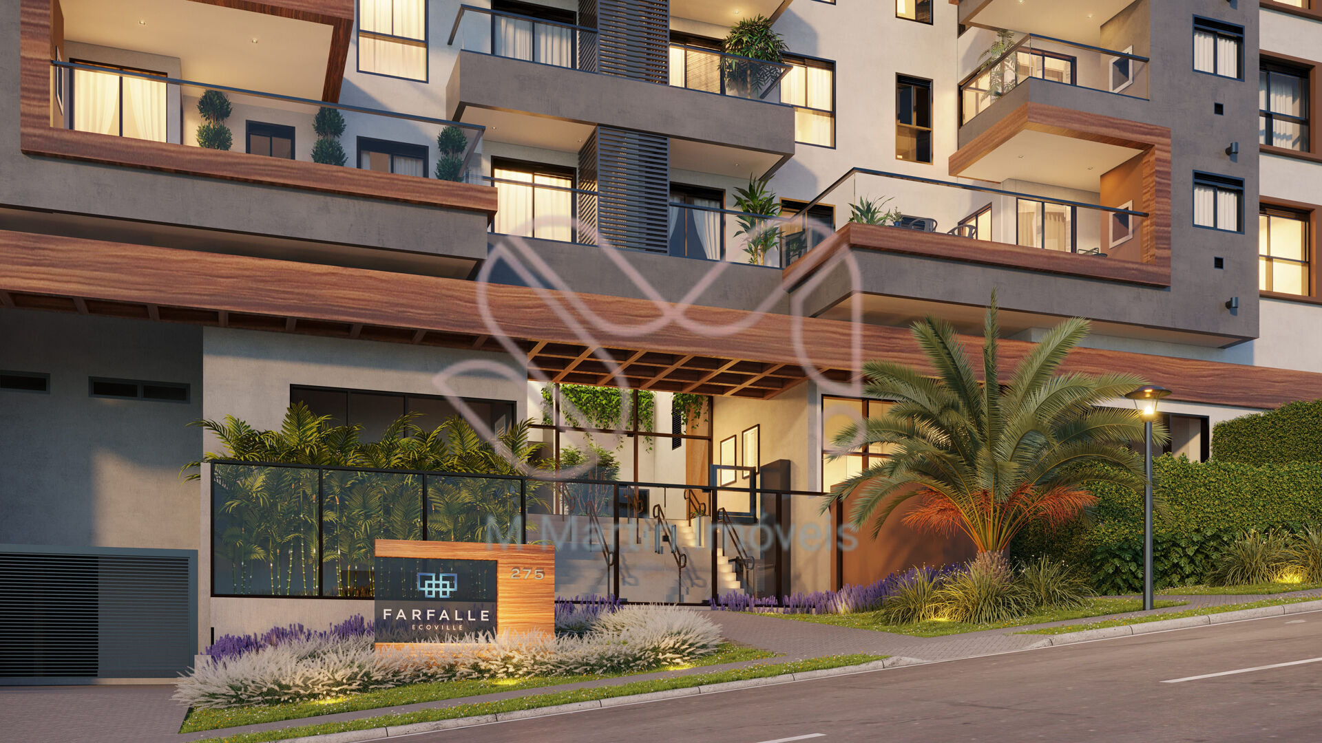 FACHADA CONTEMPORÂNEA, FRENTESAMPLAS, DE ESQUINA, EM PONTO ALTO E COMUM GRANDE BOSQUE NATIVO COM O VIZINHO. GARANTIA DE LINDAS VISTAS PARA QUEM ESTÁ FORA OU DENTRO DO FARFALLE.
